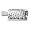 An annular cutter, much like the core drill and hole saw, cuts a groove in the metal at the periphery of the hole and leaves a solid core or coupon. They are used in magnetic drill presses with a pilot pin (drill) and most commonly have a "weldon" (universal) shank. Hougen and Jancy are both manufacturers who's brand name has become synonymous with this type of cutter. These are the fractional sized versions.
